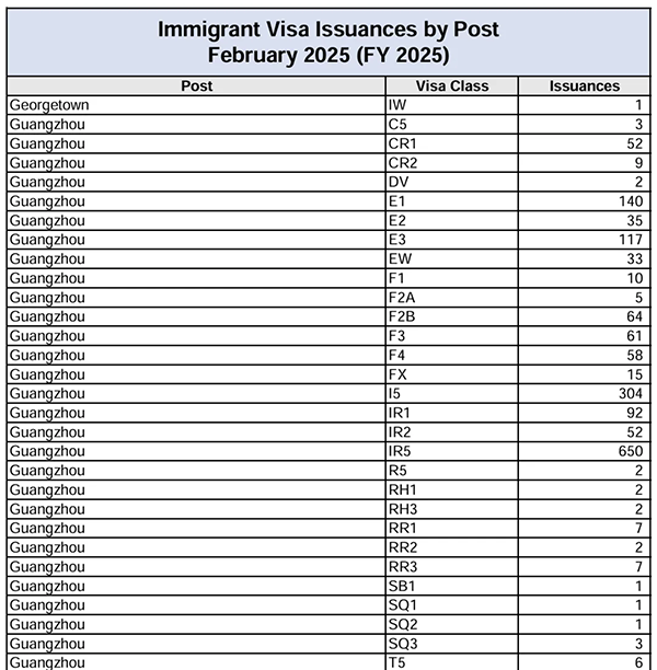 近期美国国务院发布了2025年2月的移民签证发放统计数据。统计有两份表格,一份是按照申请人出生国别发放的签证数量统计,另一份是按照各地使领馆发放的签证数量统计。