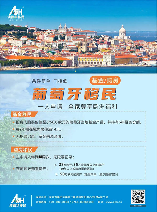 美国也是和葡萄牙签订过避免双重征税协议的国家。其目的是避免向纳税人,对同一所得双重征税,某种程度上降低纳税人的负担。 同时,葡萄牙还无遗产税,适用于家族遗产的继承。 申请条件 主申请人必须年满18岁; 无犯罪记录。 投资要求 以下投资方式任选其一 购买50万欧元以上的葡萄牙投资基金(投资期限至少5年)。 在葡萄牙非一线沿海城市(里斯本、波尔图及沿海发达地区)购买50万欧元住宅物业或35万欧元翻新物业。非住宅房产可以继续投资里斯本和波尔图的发达地区,投资门槛不变。(非住宅不动产包括酒店不动产、办公不动产、商铺不动产)。 其中 葡萄牙购房移民优势 审理相对较快,约10个月左右获批; 对申请人无学历、语言、资金来源、商业背景、移民监等要求; 子女可享受免费12年教育; 5年后可转永居或入籍; 拥有葡萄牙身份证,可以自由在欧洲申根成员国生活;护照免签证进入全世界180多个国家(包括美国、加拿大、澳大利亚等国家); 可工作经商。