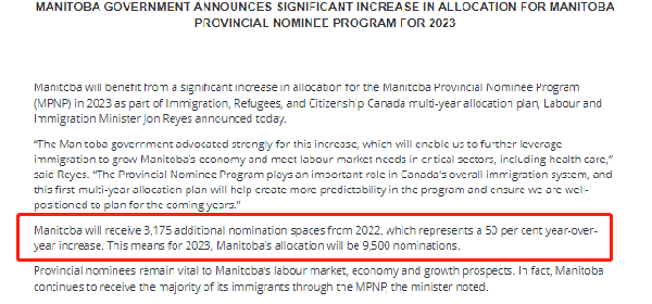 各省人口增长 艾伯塔省 2022年1月1日:4,482,385 2023年1月1日:4,647,178(+164,793;+3.7%) 不列颠哥伦比亚省 2022年1月1日:5,251,578 2023年1月1日:5,399,118(+147,540;+2.8%) 萨斯喀彻温省 2022年1月1日:1,185,311 2023年1月1日:1,214,618(+29,307;+2.5%) 曼尼托巴省 2022年1月1日:1,398,303 2023年1月1日:1,431,792(+33,489;+2.4%) 安大略省 2022年1月1日:14,940,912 2023年1月1日:15,386,407(+445,495;+3.0%) 魁北克 2022年1月1日:8,637,650 2023年1月1日:8,787,554(+149,904;+1.7%) 为了能够吸纳更多新移民,填补加拿大劳动力市场。近日,安省、萨省、阿省、曼省都公布了2023-2025年的省移民配额,共同点是配额普遍大幅增加,安省2023年的省提名配额甚至增加了近70%! 安省 2023年配额增加近70% 安省与加拿大联邦政府达成了加强安省移民提名计划(OINP)的协议,计划将安省接收经济类移民的人数翻倍。到2025年,安省在省移民提名计划下的移民名额将超过18,000个。 图片信息来源于网络,版权归原著所有 2023年安省省提名配额相比2022年的9750个增幅近70%,这意味着将有更多的人能通过安省省提名的方式获得移民资格,成功移民加拿大。 萨省 2025年配额将达8500人 根据萨省公布的消息,加拿大联邦政府和萨省政府达成协议,将增加萨省省移民提名项目(SINP)名额。 未来3年的配额如下:2023年:7250人;2024年:8000人;2025年:8500人。 图片信息来源于网络,版权归原著所有 从原来每年6000人的名额提高到2025年的8500人,增幅达42%。可见萨省想要通过SINP吸纳更多新移民的决心。 阿省 2023年配额增加50% 阿省的省提名项目AAIP未来3年的配额将有大幅度的提升:2023年9750个,2024年10140个,2025年10849个。 图片信息来源于网络,版权归原著所有 以2022年的6500个名额为基准,增幅则分别为50%、56%、69%。 曼省 2023年配额增加近50% 曼省宣布,2023年的省提名配额增加到9500个,比去年增长3175个,增加了近50%的配额。 图片信息来源于网络,版权归原著所有 另外,曼省今年还新增了定向邀请,邀请分数比普通省提名低很多。 未来三年配额都将不断增加,足以看出联邦和各省对于省提名计划的重视。省提名的项目有很多,大致可以分为技术和商业两大类。其中,技术类中雇主担保移民项目更加适合中国申请人,具有条件宽松,无投资额要求,获批快、要求低、流程简单等众多优势。 条件宽松 大多数省份的雇主担保移民50岁以下都能申请。另外雅思和学历的要求也相对较低。 风险低 无需投资,找到工作后即可申请省提名。省提名或工签获批之后可以登陆加拿大,而等人到了加拿大后,移民已经接近成功。相比投资移民等移民方式,前期的资金、时间风险会小很多。 名额多,获批快,成功率高 各省的省提名配额都在增加。并且,雇主担保移民的基础是企业的用人需求急需满足,在申请人的分数满足要求,并且和雇主匹配的情况下,申请成功率相对较高。 免责申明:本文由小编综合整理,内容及图片版权均归原作者所有。若未能找到文章或图片出处,望谅解。如果有侵权行为,请与本账号联系,我们会在第一时间申明原文作者或者将侵权文章或图片删除,谢谢!