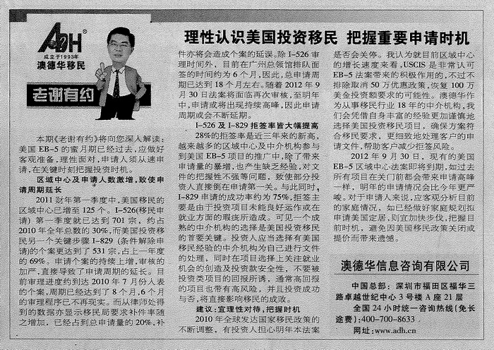 2011年6月30日《深圳商报》A22版-《理性认识美国投资移民 把握重要申请时机》