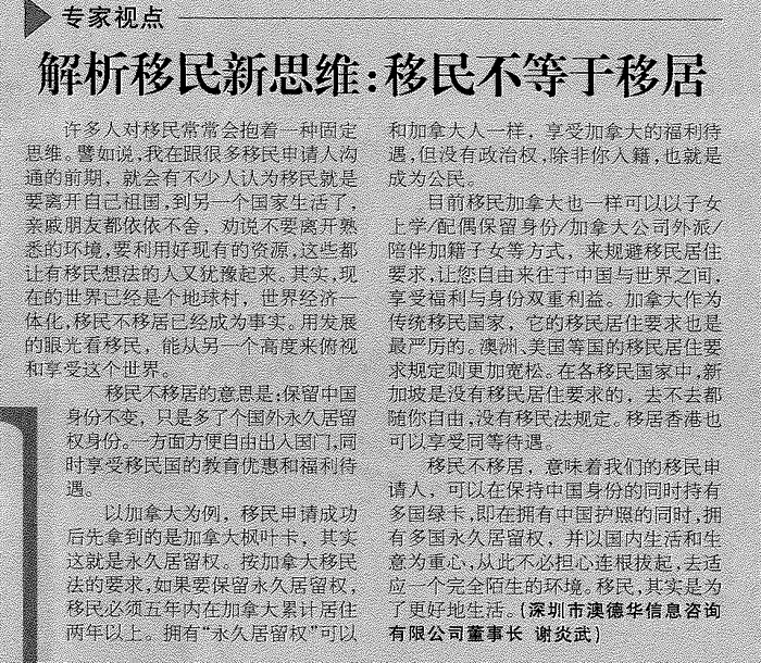 2011年7月20日《深圳特区报》D7版-《解析移民新思维,移民不等于移居》