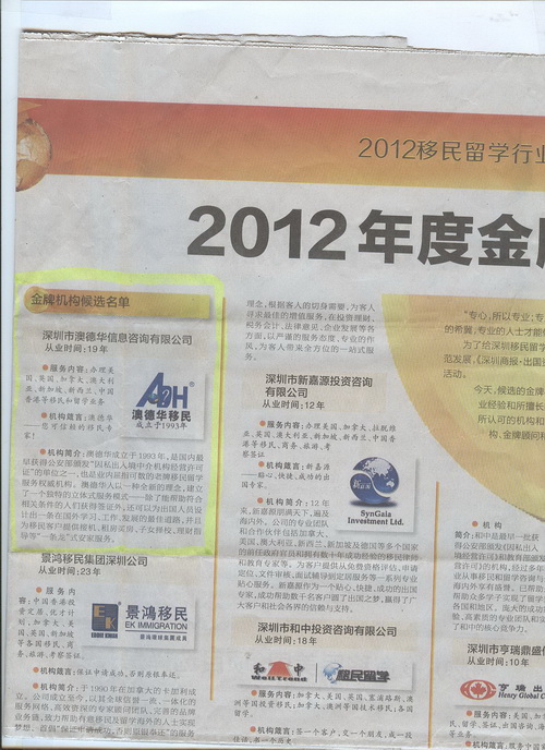 2012年9月13日《深圳商报》At04-At05版-《2012移民留学行业金牌顾问机构》